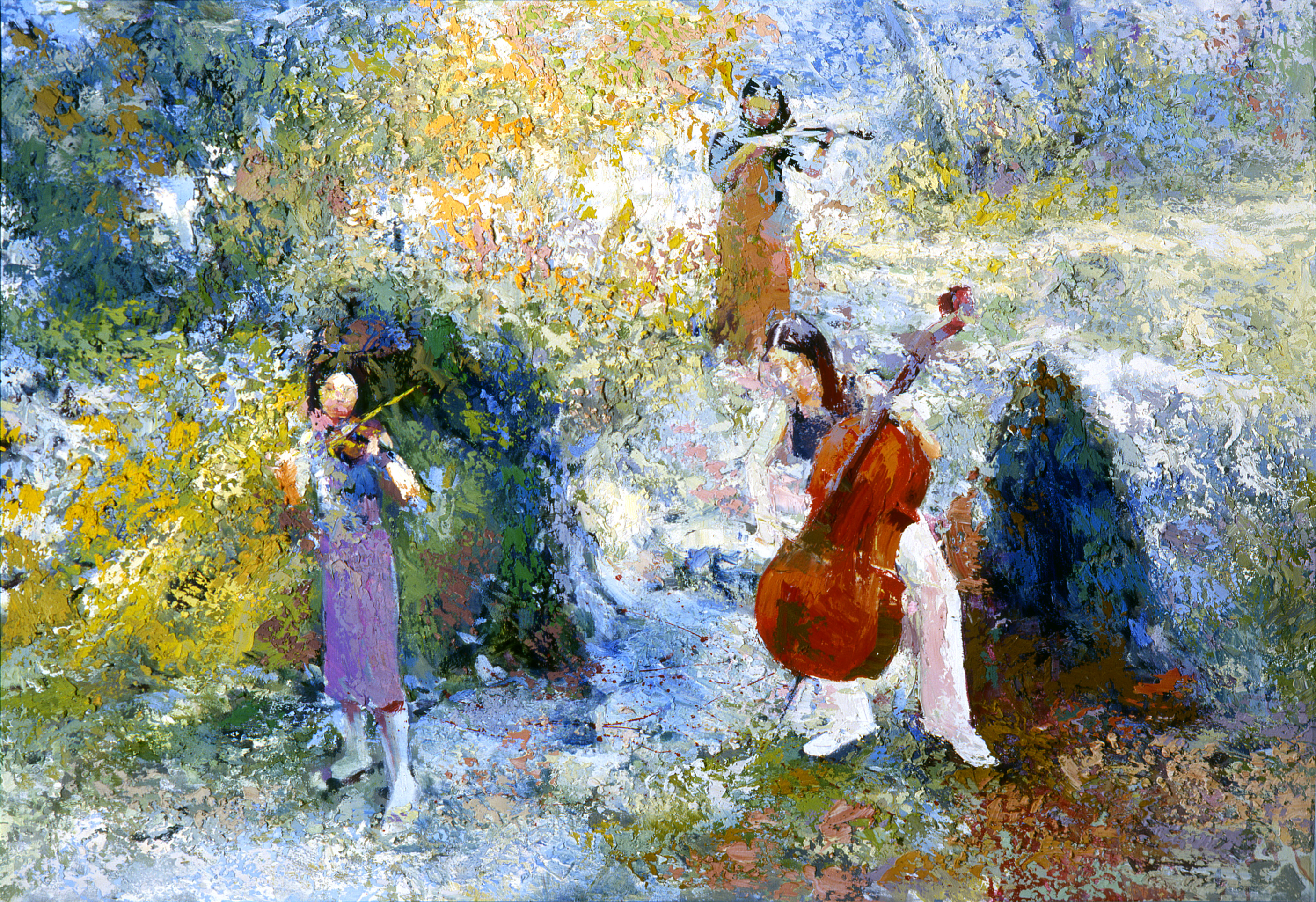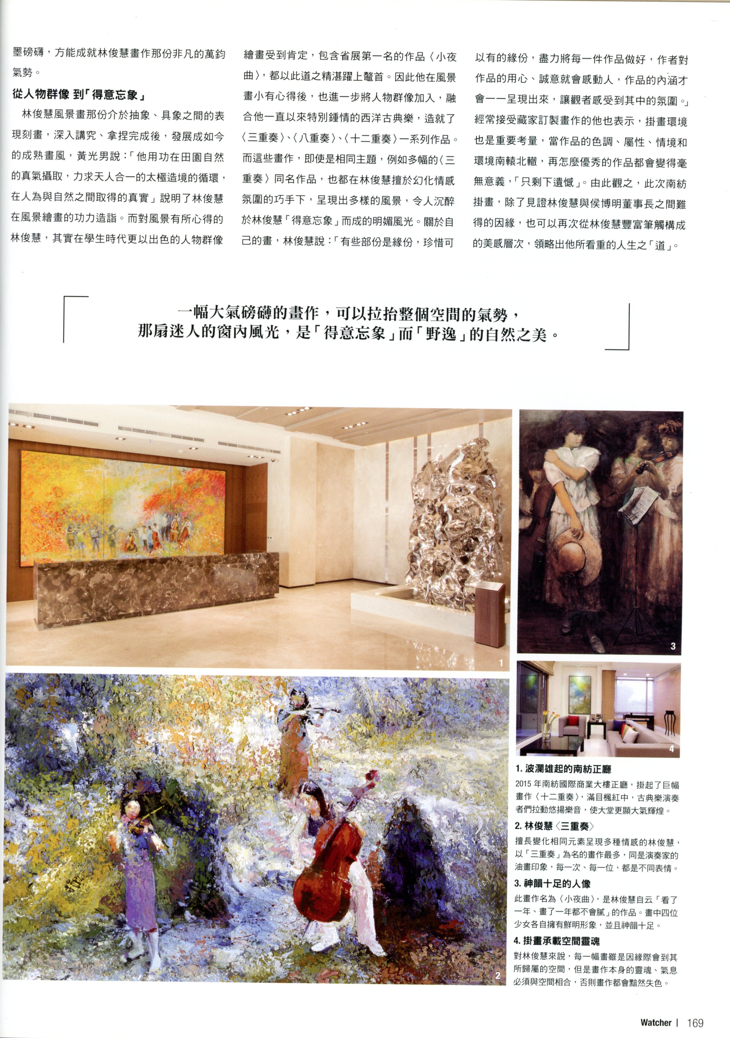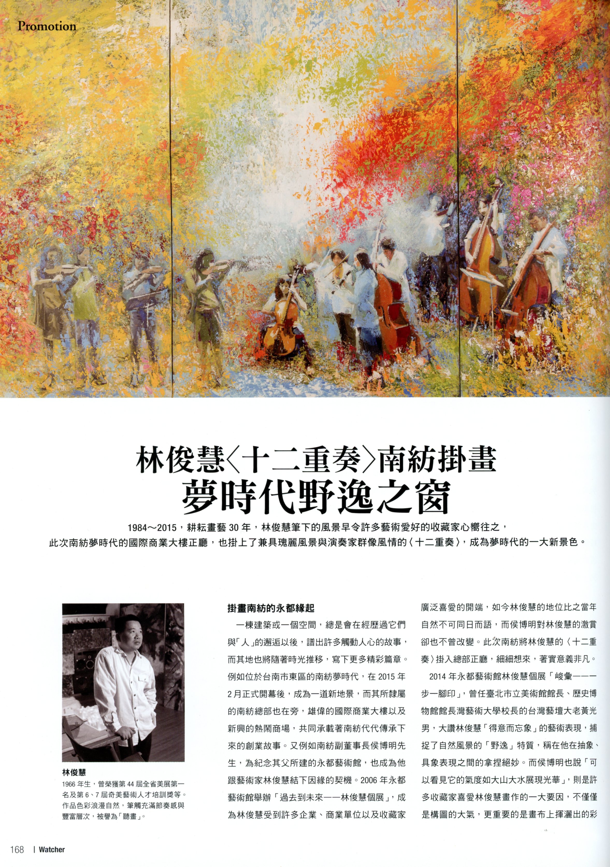 1984〜2015,耕耘畫藝30年,林俊慧筆下的風景早令許多藝術愛好的收藏家心嚮往之,此次南紡夢時代的國際商業大樓正廳,也掛上了兼具瑰麗風景與演奏家群像風情的〈十二重奏〉,成為夢時代的一大新景色。
