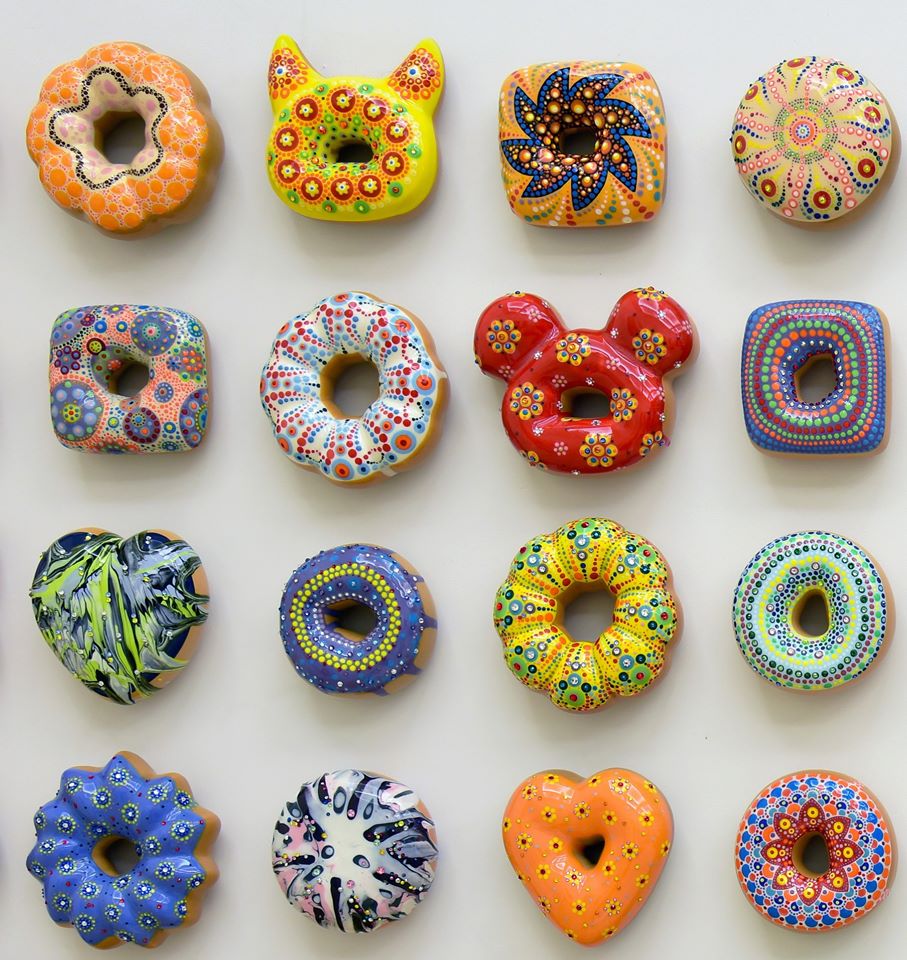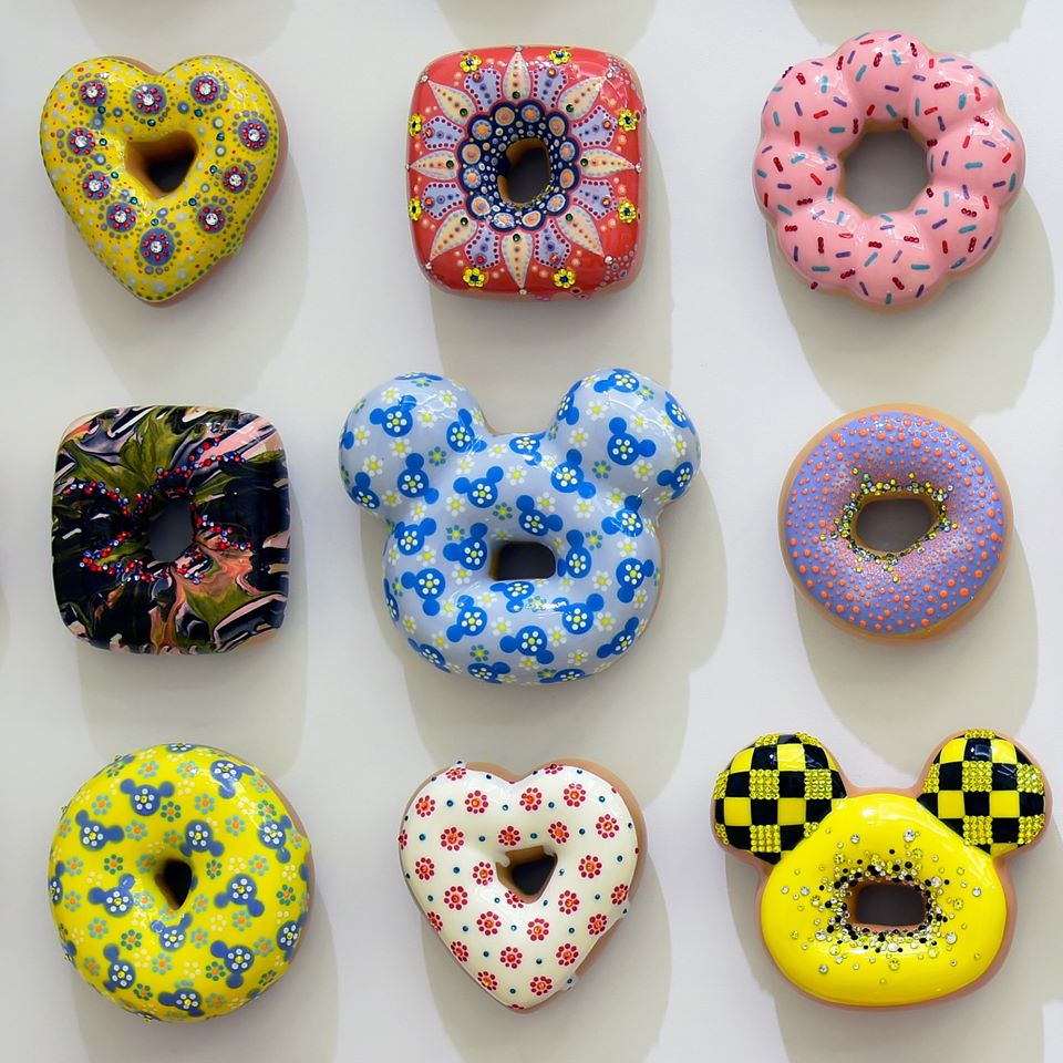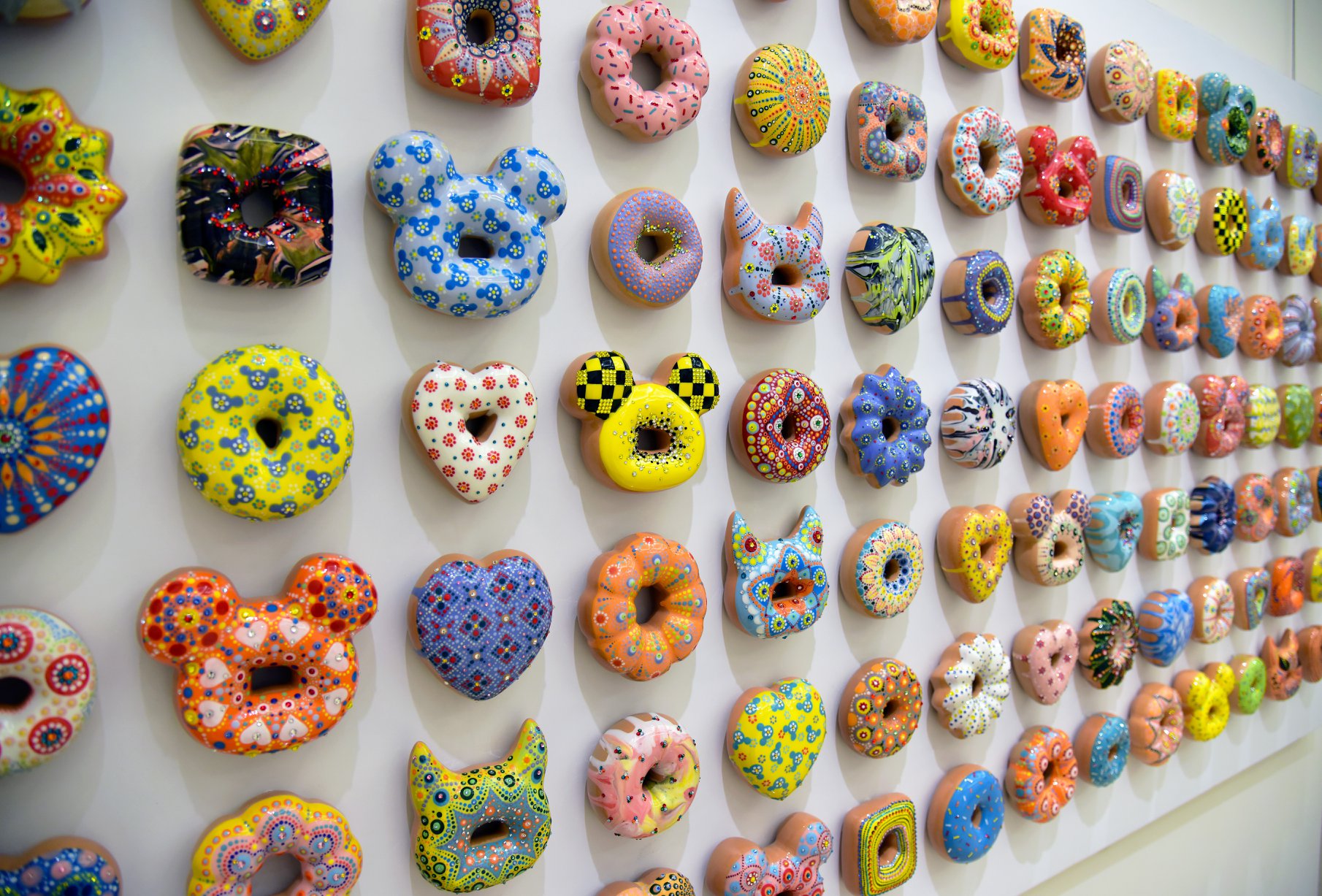 這些帶有令人不禁想大快朵頤一番的豐富色彩的甜甜圈,提起眾人孩提時代最純粹簡單的微笑,也講述了關於藝術界及其他領域和消費主義的故事,更是對現代藝術的敏銳觀察,同時也象徵了他堅守初心的提醒。在每次展出中,藝術家都親自規畫、排列及調整每個甜甜圈的位置,造就次次不同的觀展體驗,創造與觀者的共鳴及對話。
