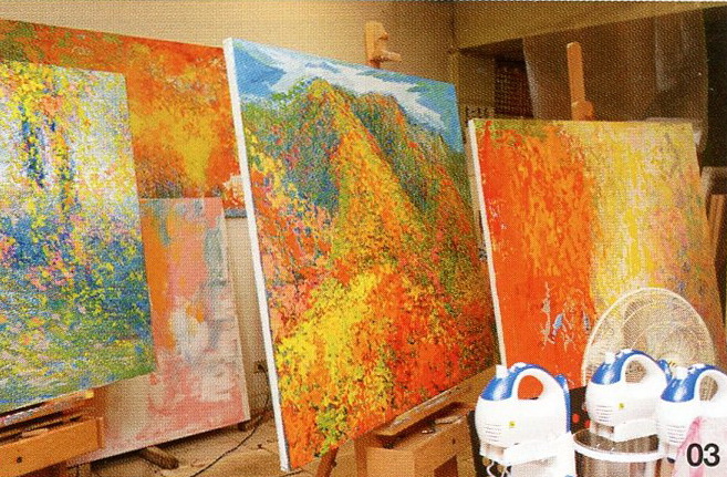 林俊慧對於畫作的調色技巧也是高深莫測。除了基礎的單色與調和色,每種顏色都還有它的寒暖色調。例如綠色的寒色調帶點藍、帶點綠,但橘色的寒色調就很難調了,那是一種橘中帶紫紅的色彩,屬於中間色調,一般人没有經過長時間訓練,很難調得出來。其實調色比判斷色彩的學問還大,要把顏色調到看起來很乾淨,要照順序調,那顏色是一層一層不斷被帶進來,一層一層被混進來的。「調色是一種漸增與漸減的過程,中間你還要會記色。你要記住顏色的搭配組合,不然你下次就調不出來了。這其中還有一個重點,就是有時候你在調色盤上看到的顏色,會與你實際塗抹在畫布上所呈現的視覺反應不一樣,因為顏色會產生對比變化。其實有點像是指揮家在指揮時,他耳朵聽見的聲音平衡跟音感,與你坐在音樂廳的某某排,第幾個位置是截然不同的。調色也是一樣,所以你要學會判斷,這就跟你要會去學習判斷音響調音的方向是否正確一樣。如何平衡的運用色彩如同音響調音,最終要取得的,是一種平衡美感。如果你問我的標準,我會說我要我的畫作每一公分都有變化。這看似簡單,卻也是最難的部分,需要從不同的顏色搭配中,不斷的去實驗」。當天的林俊慧這樣告訴我。