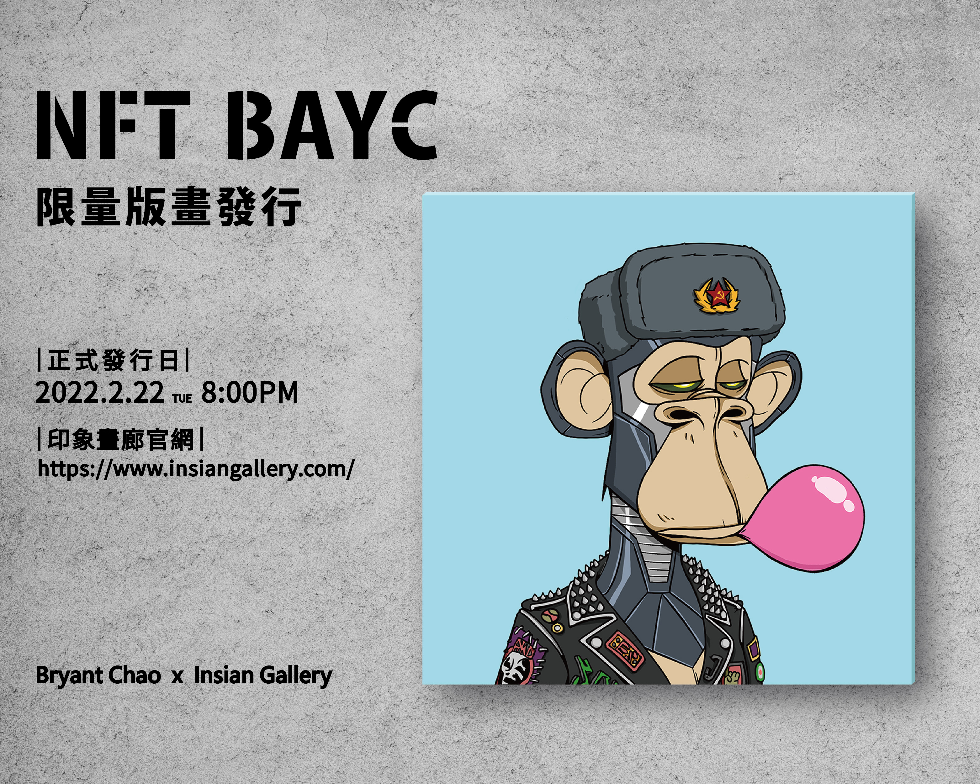BAYC機器泡泡猿版畫正式發行日期為2022年2月22日晚上8點,限量50版,每件作品皆有無聊猿藏家Bryant Chao的親筆簽名。 訂購平台為印象畫廊官方網站 : https://www.insiangallery.com/artworks/49882