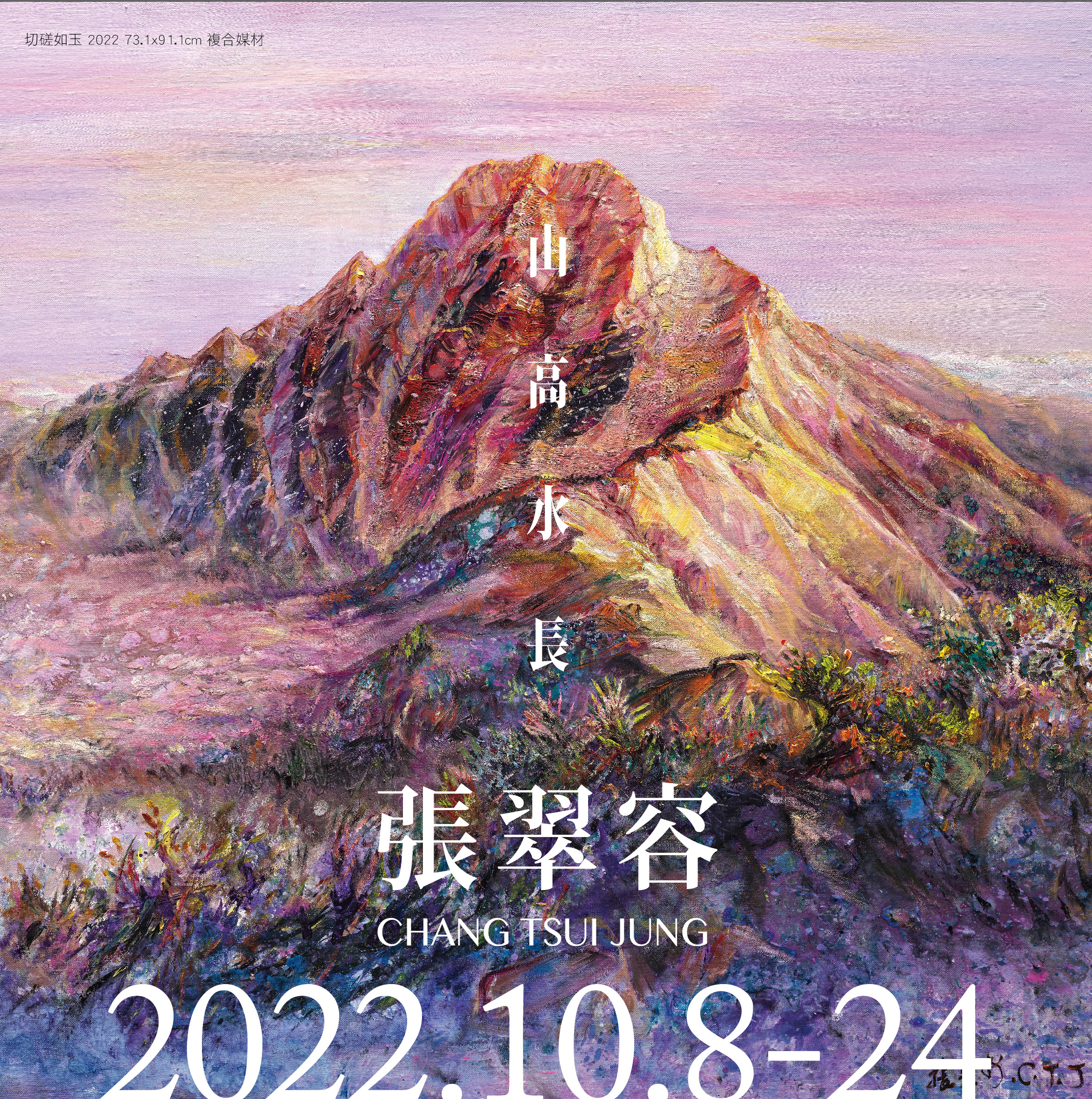 張翠容過去的風景畫以筆法細膩、精雕細琢的近景動植物為主,氤氳繚繞的遠山充滿水墨逸趣,但難以辨認出確切的地點。但此次的展覽《山高水長》,則是將對臺灣土地的孺慕之情,以及面對家鄉自然美景時生發的感受與哲思,透過形構玉山、大霸尖山、雪山等地之名山勝水表達出來。她的家鄉南投縣位居臺灣地理中心,在自然環境上可謂得天獨厚之地:臺灣最高峰玉山、最大天然湖泊日月潭、最長河流濁水溪的源頭皆位於該縣。這些地點明確的作品印證了張翠容作品中的地誌學轉向。多幅作品以直式構圖,人們熟悉的玉山等山岳主峰佔據了約三分之二的畫面,畫面下方三分之一的部分則分別描繪了山中常見的花草、鳥禽、動物,如箭竹,玉山圓柏、金翼畫眉、黃喉貂等,著力於自然環境的生態描寫,展現出生生不息的力量。幾幅大霸尖山,則分別從不同的距離與角度,以水墨皴法製造山壁厚重的感覺;〈大霸尖山(三)〉前景還呈現著波光粼粼,映著倒影的黑水潭。山峰與前景之間經常以雲霧等水墨畫的手法隔開,製造了某種虛無縹緲的空間感。