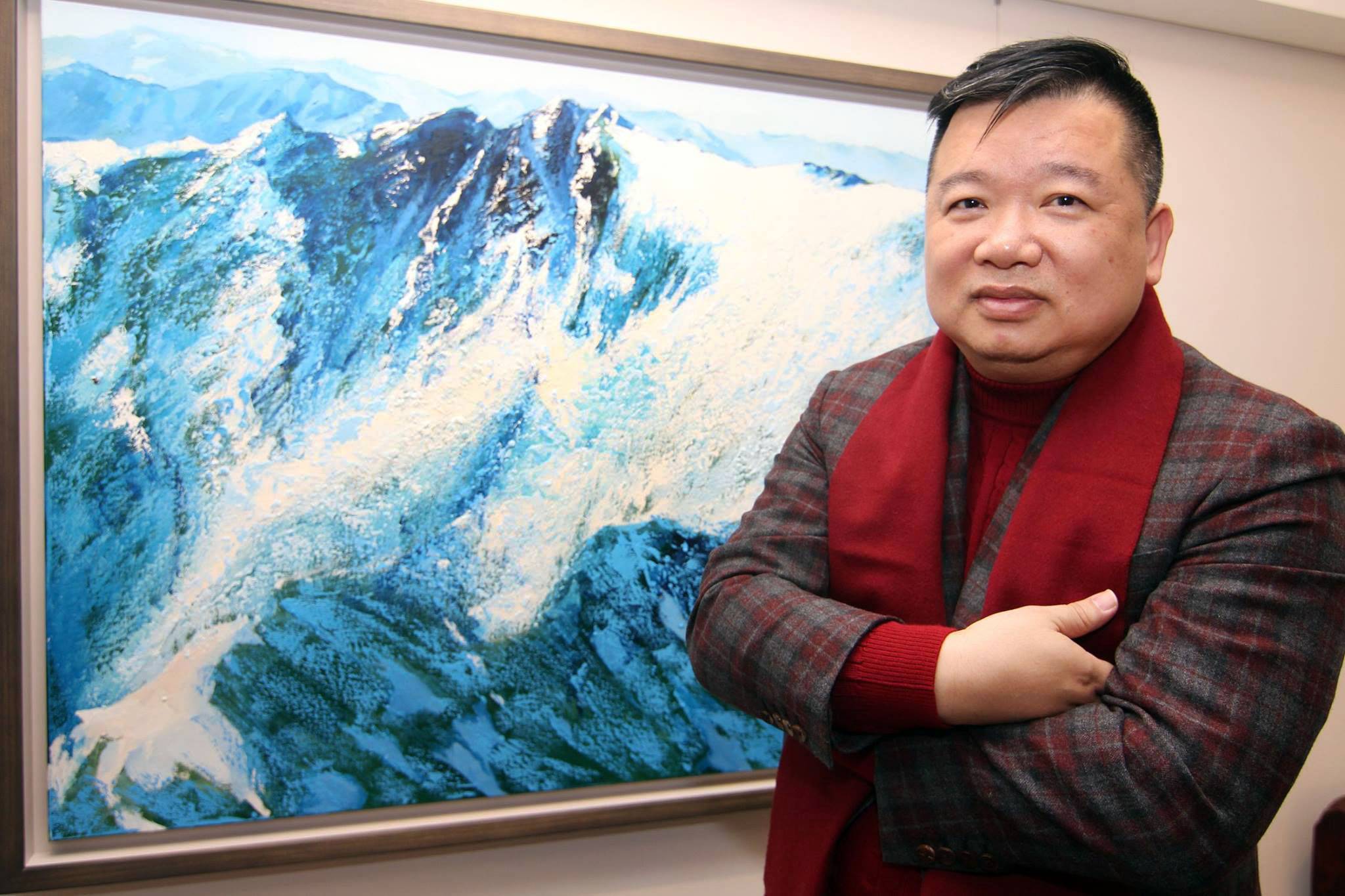 林俊慧老師與其作品「玉山」。