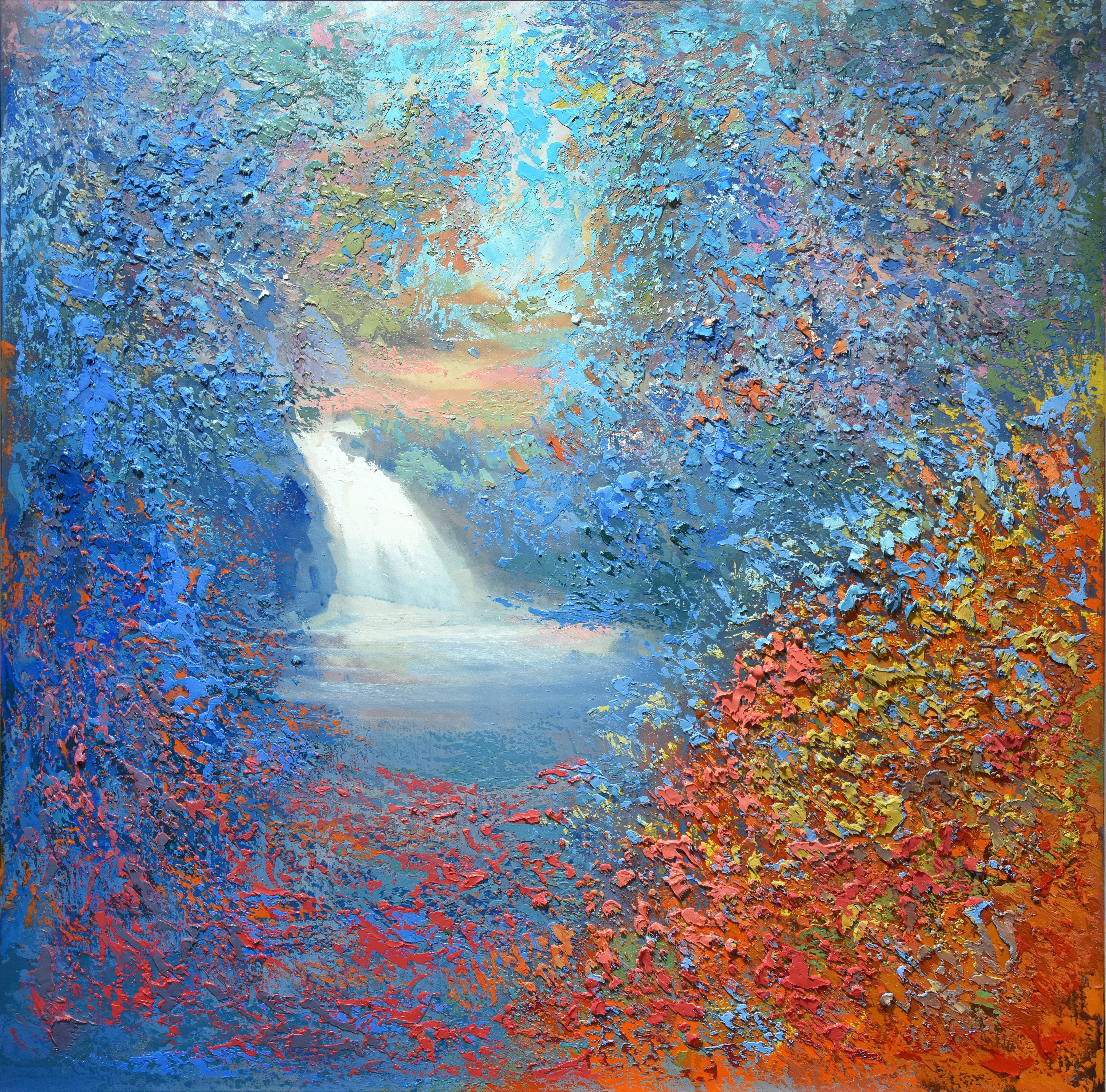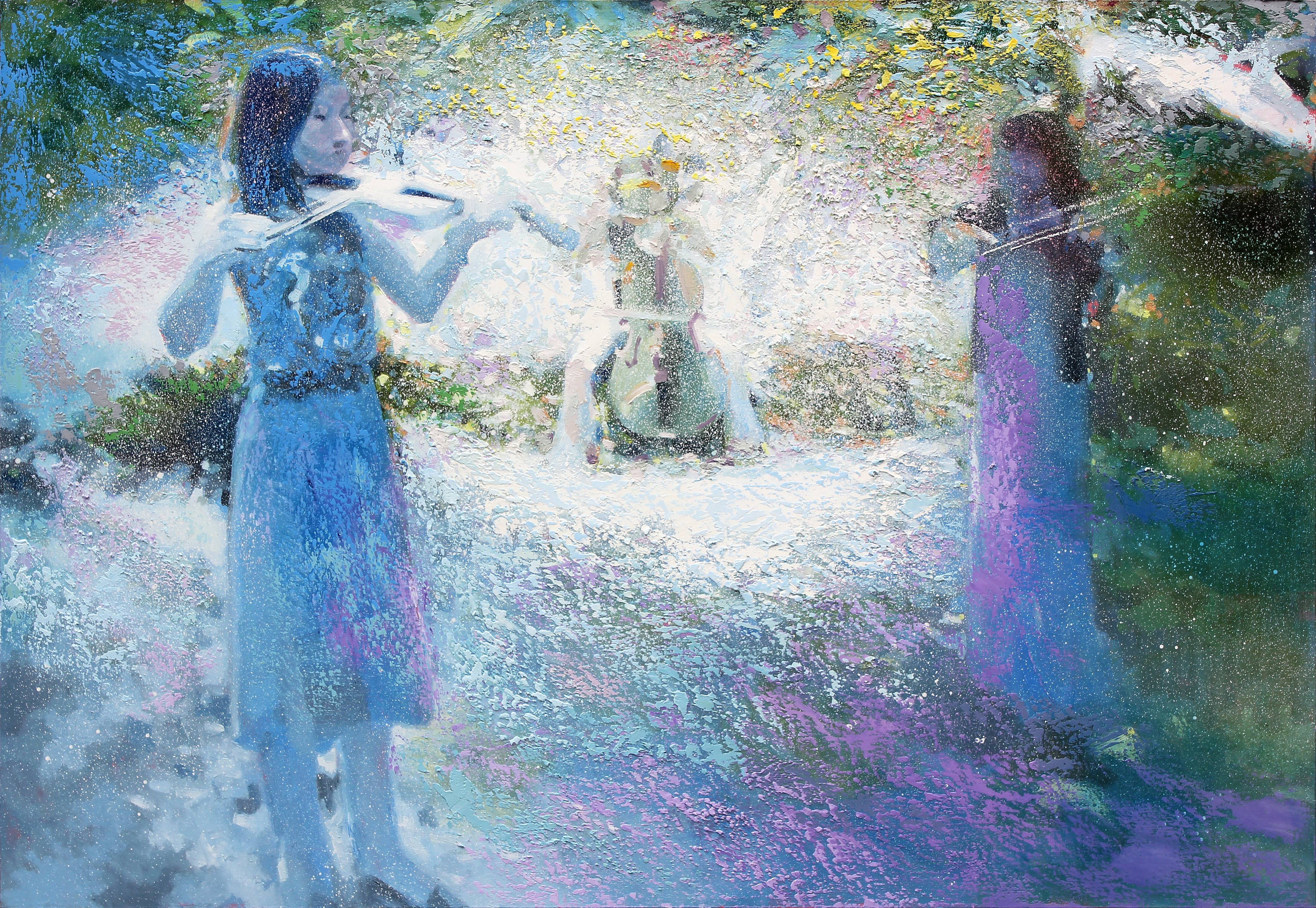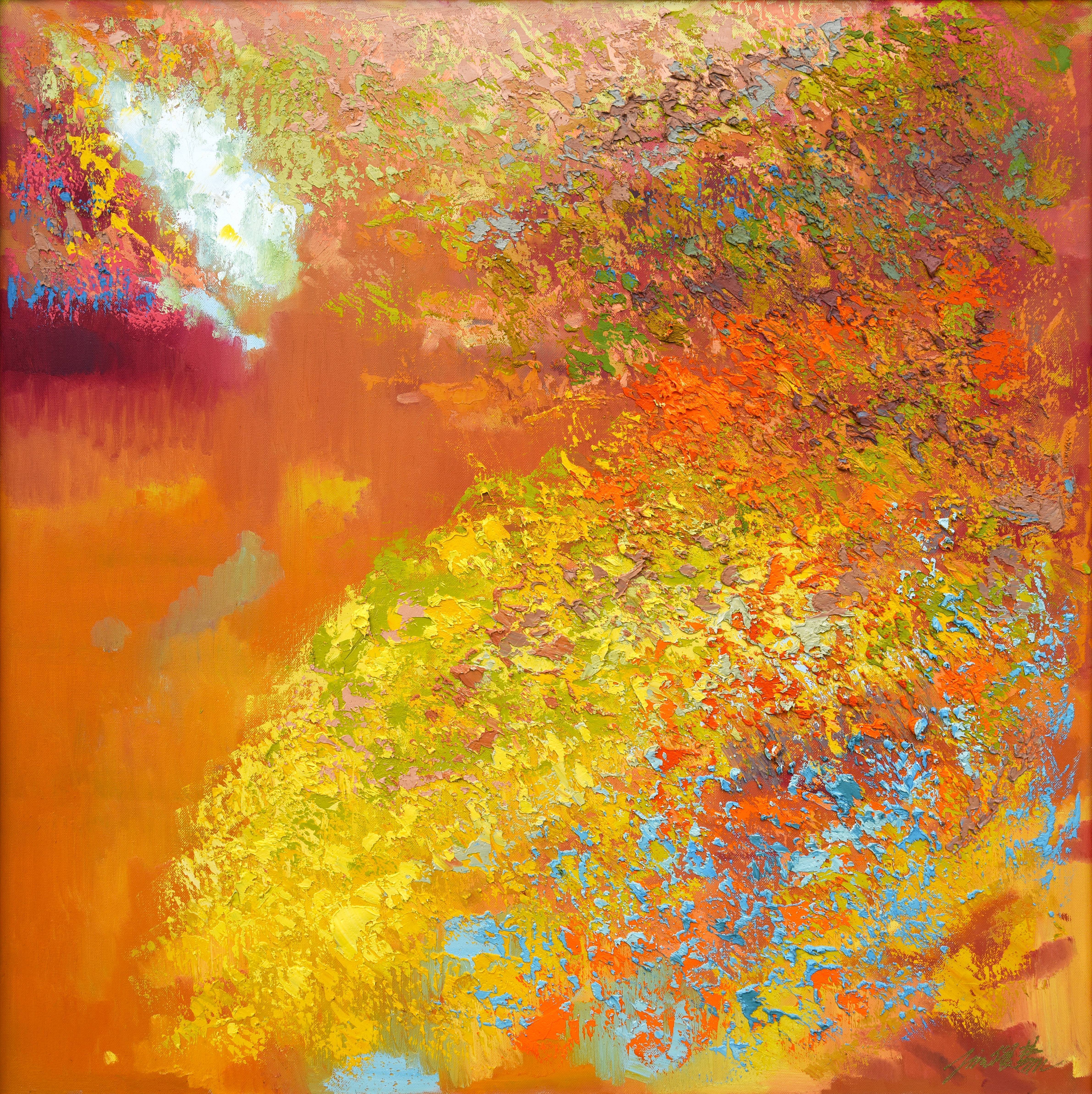 色彩之於他,一如人類對生命的終極探問。如何在筆畫間安排如音律般的色彩律動與筆觸,如何在不同長短波能間交織堆疊顏料,儼然成為林俊慧藝術人生的課題。「一開始,『四季』還很好玩,八張也還可以,畫到十二張就瘋掉了。『二十四節氣』系列到後來根本調不出顏色了。但這才是真正拼高下、用功與否的時刻。創作者若真有所思所想所感,都將一一凝結釋出。」對林俊慧而言,在這麼大的畫布上把顏色從左邊跑到右邊,色階的演進不單是平面的,而是具深度立體式的。立體的,是那外在自然幻化於心的世界。 在較厚的突出筆觸上,幾處經色階、比例、透視而產生若隱若現、時出時沒的效果,與其他平滑朦朧之處形成對比之餘,也推遠了畫面的空間感。此遊走於明亮與穢暗、淋漓與模糊、零碎與完整間的色彩路徑,不光玩轉了對色彩明度既定的空間想像,現實景物層次亦在不同的顏色組織下,使看似簡單的結構因色階調度的差異、空氣感的大小安插、物件元素的疏密排列,在在産生了複雜的畫外音。誠謂「意於何處,藝之所在」。