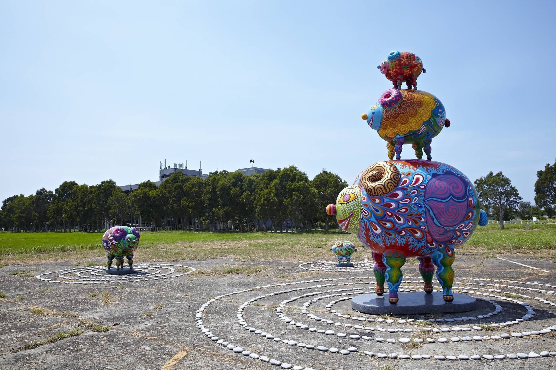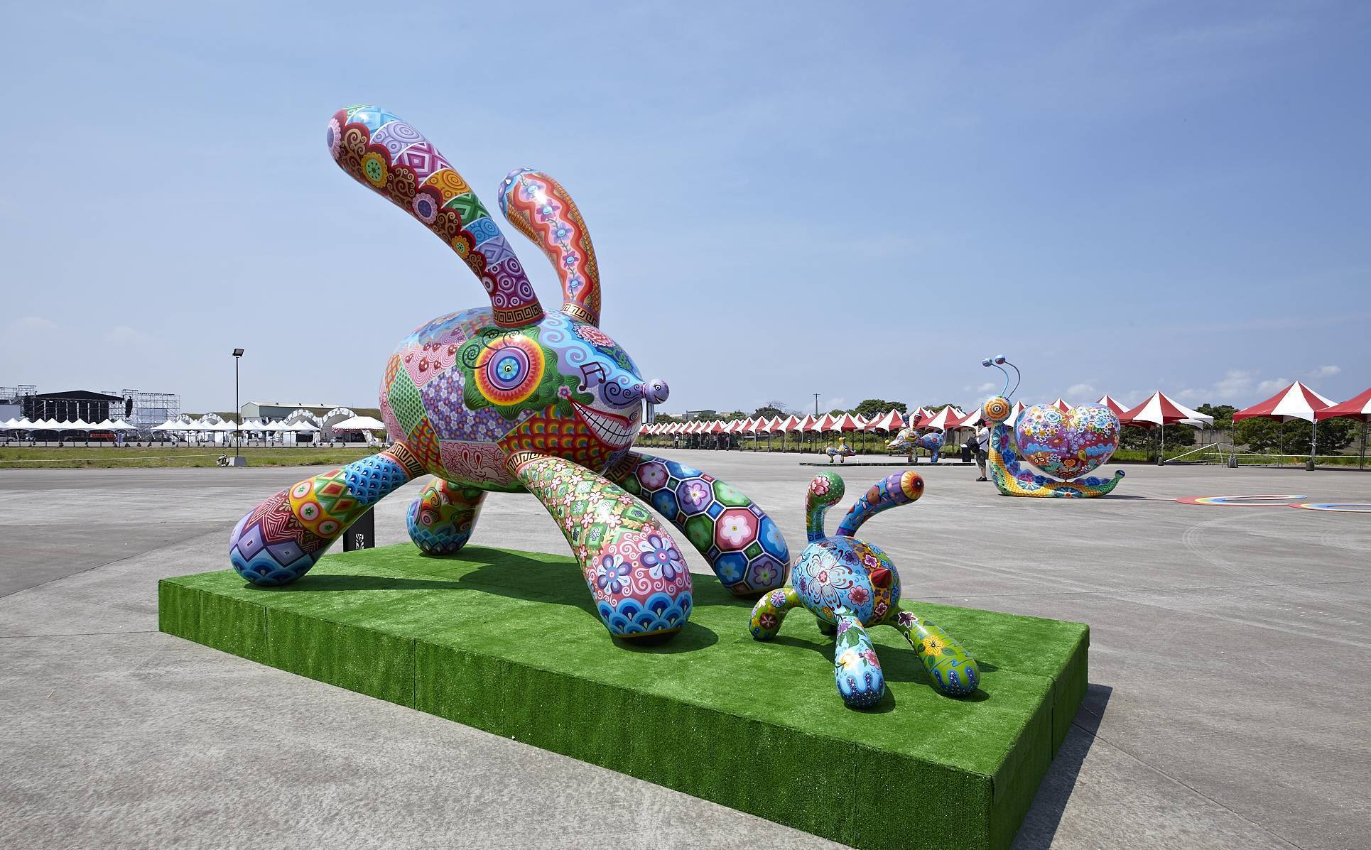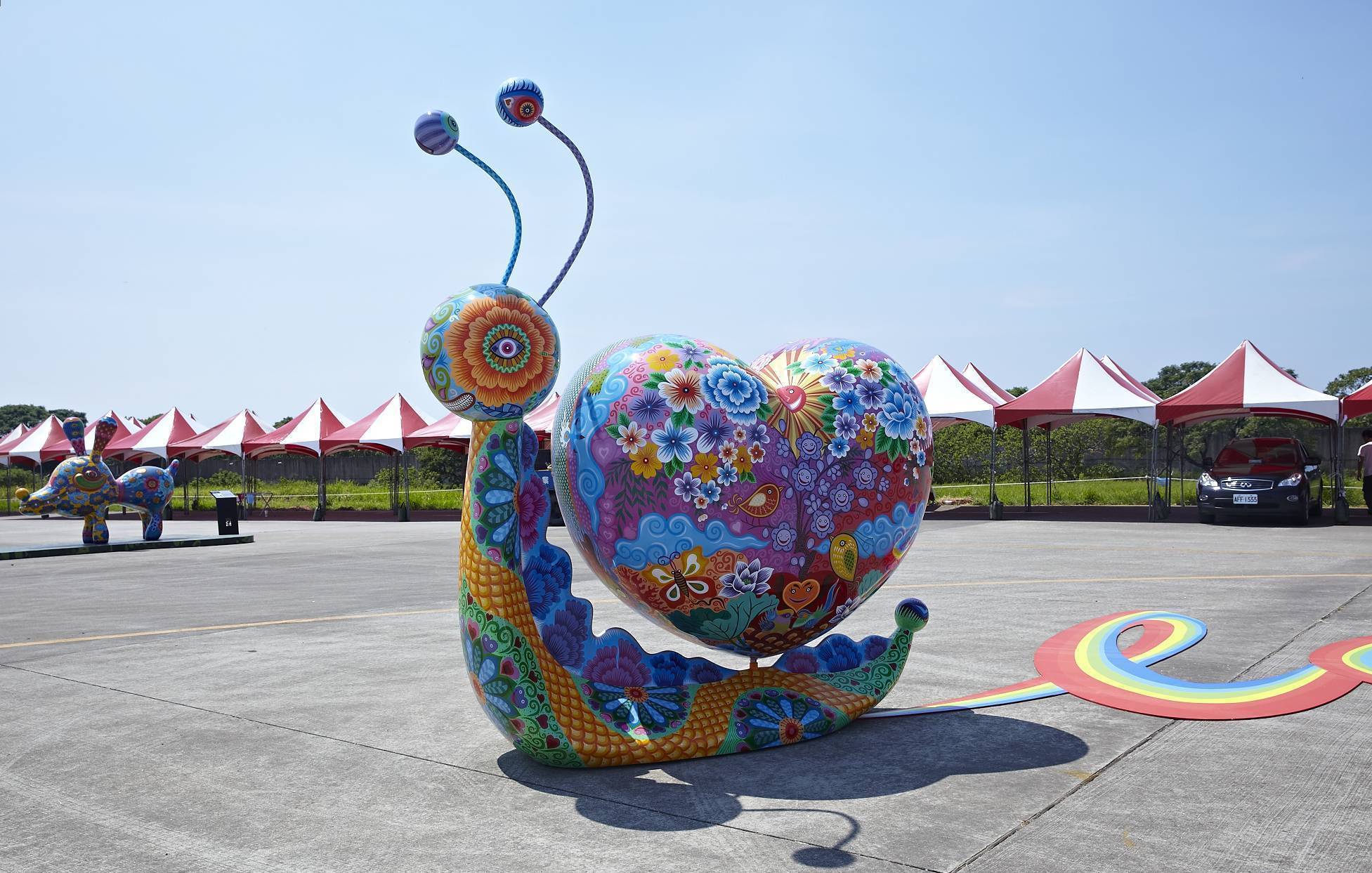 本次參與國際展出,藝術家洪易特別規畫18件中大型雕塑,包含經典原創作品「分享象」、「三羊開泰」、「梅花鹿」、「馬上發財」等,以及專為此次展出製作的全新雕塑-「愛心蝸牛」,使其創作融入於天地廣闊之間,與原命名為"黑貓中隊"的展覽區域-桃園航空城,進行一場藝術的交流與對話。